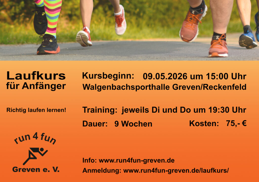 Der Lauf- und Walkingverein Run4fun Greven e.V. bietet wieder einen Laufkurs für Einsteiger ein. Egal ob Neu- oder Wiedereisnteiger. Hier werdet ihr von erfahrenen Laufinstruktoren begleitet, um das Ziel „Eine Stunde laufen ohne Pause“ zu erreichen.