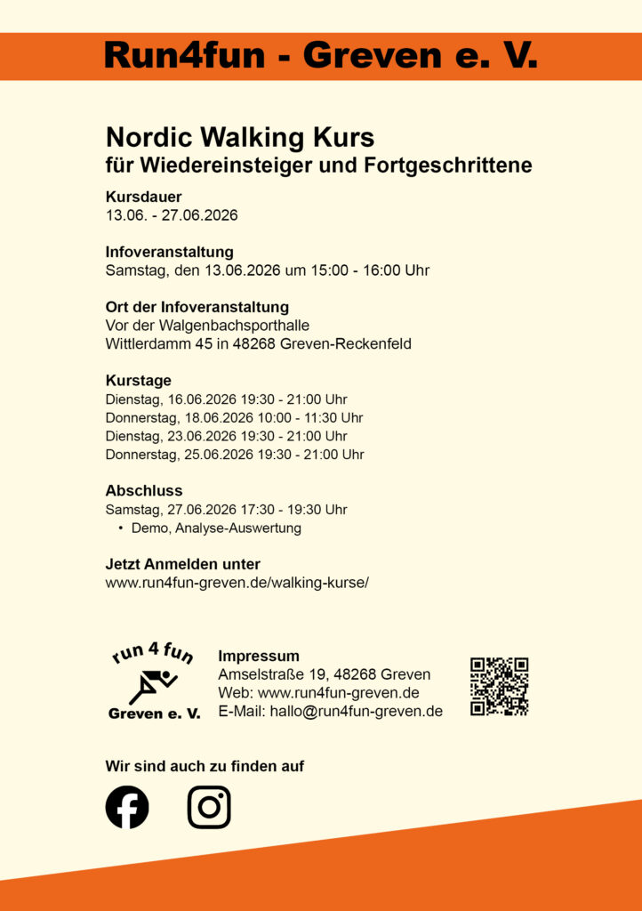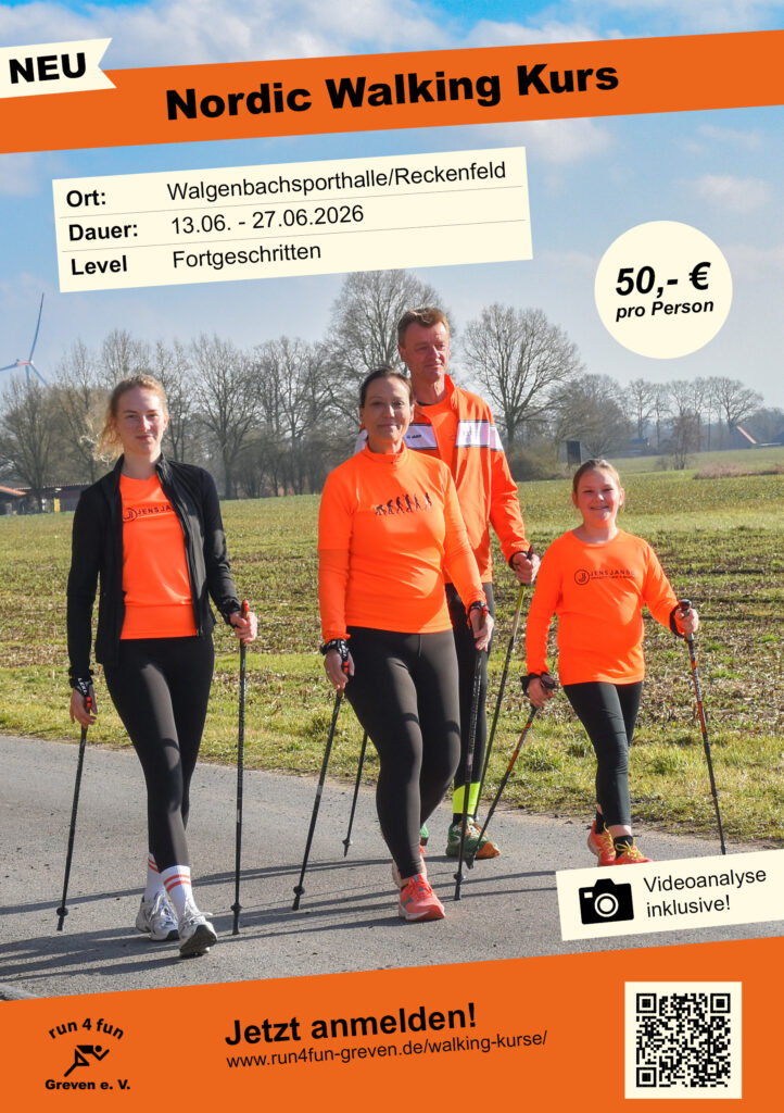 Passend vor dem Sommer startet der Lauf- und Walking Verein Run4fun-Greven e.V. in Reckenfeld einen Nordic Walking Kurs für Einsteiger. Über 4 Wochen werden dienstags und donnerstags von 19:30 bis 21:00 Uhr Schritt für Schritt die richtige Körperhaltung, Umgang mit den Stöcken sowie die richtige Bewegungstechnik vermittel und geübt. Der Kurs schließt mit dem Erreichen des Nordic Walking Abzeichen Stufe 2 des Deutschen Leichtathletik Verbands ab. Die erforderlichen Nordic Walking Stöcke werden für die Dauer des Kurs in der richtigen Länge vom Verein zur Verfügung gestellt. Der Nordic Walking Kurs startet am Samstag, den 18.April 2026 um 15:00 Uhr mit einer kostenlosen Informationsveranstaltung und endet am 17.Mai mit Übergabe der Nordic Walking Abzeichen Stufe 2. Treffpunkt ist vor dem Eingang der Walgenbach-Sporthalle, Wittlerdamm 45 in Reckenfeld.